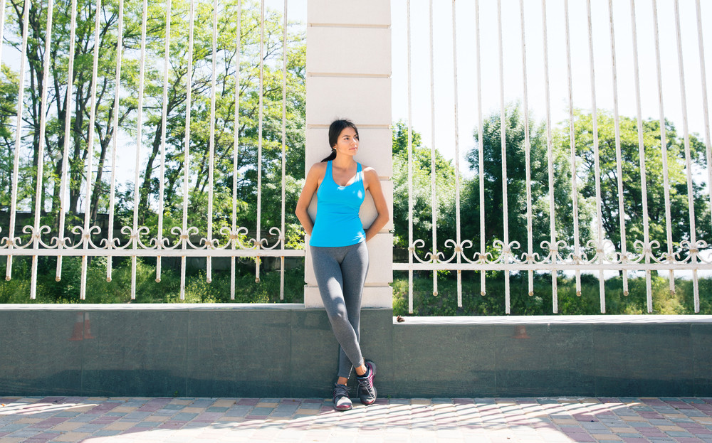 Full length portrait of a pensive sporty woman leaning on the fence outdoors